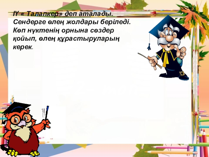 2- топІҮ « Талапкер» деп аталады. Сендерге өлең жолдары беріледі. Көп нүктенің орнына сөздер қойып, өлең құрастыруларың
