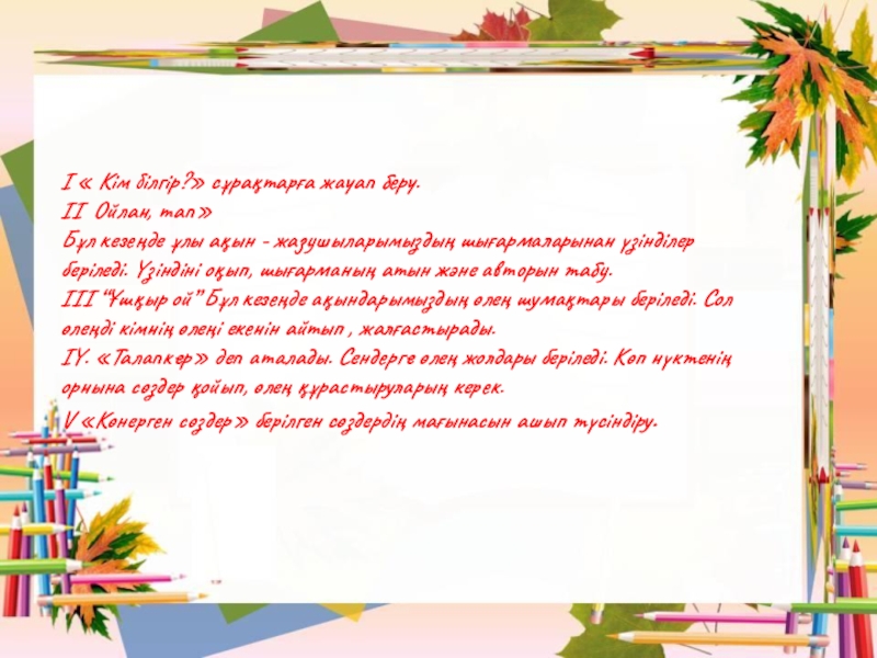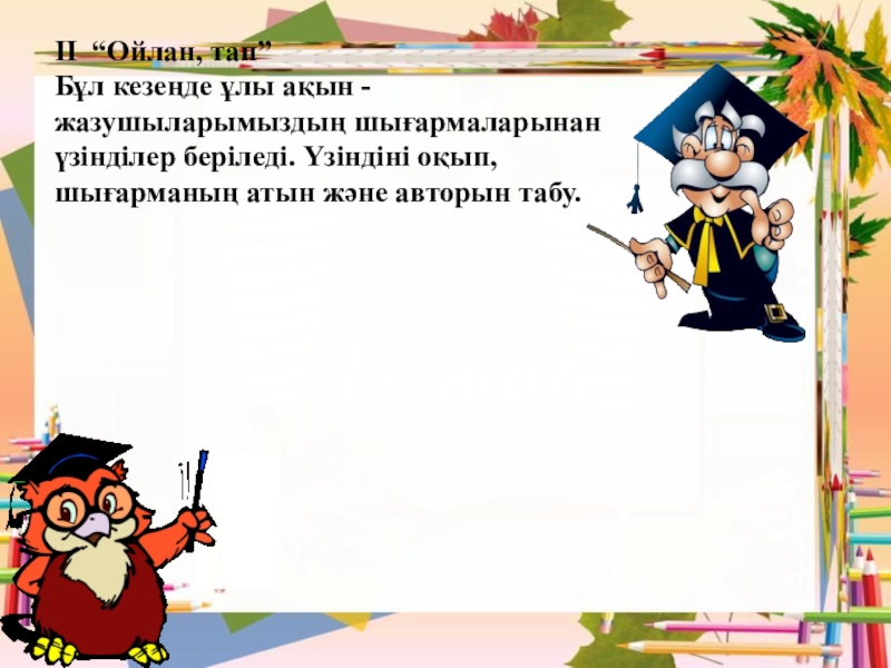 1- топІІ “Ойлан, тап” Бұл кезеңде ұлы ақын - жазушыларымыздың шығармаларынан үзінділер беріледі. Үзіндіні оқып, шығарманың атын