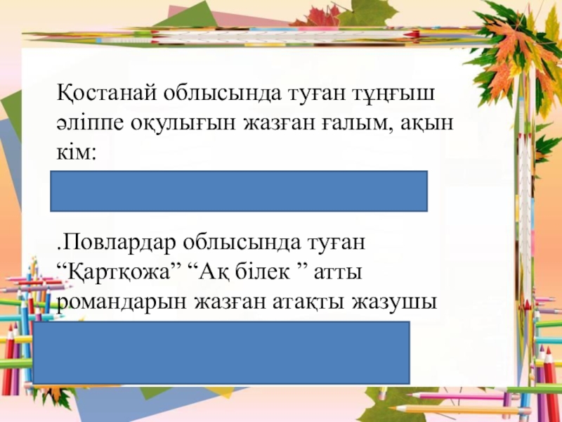 Слайд 8Қостанай облысында туған тұңғыш әліппе оқулығын жазған ғалым, ақын кім: