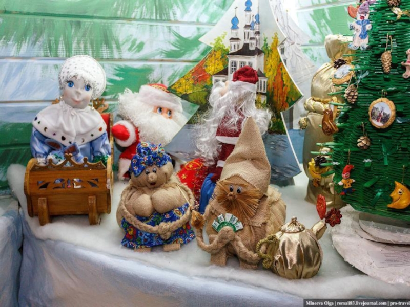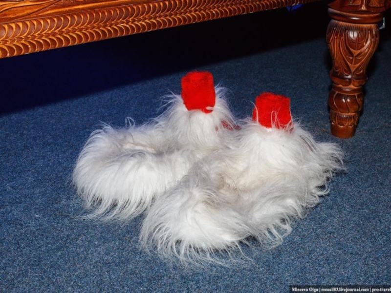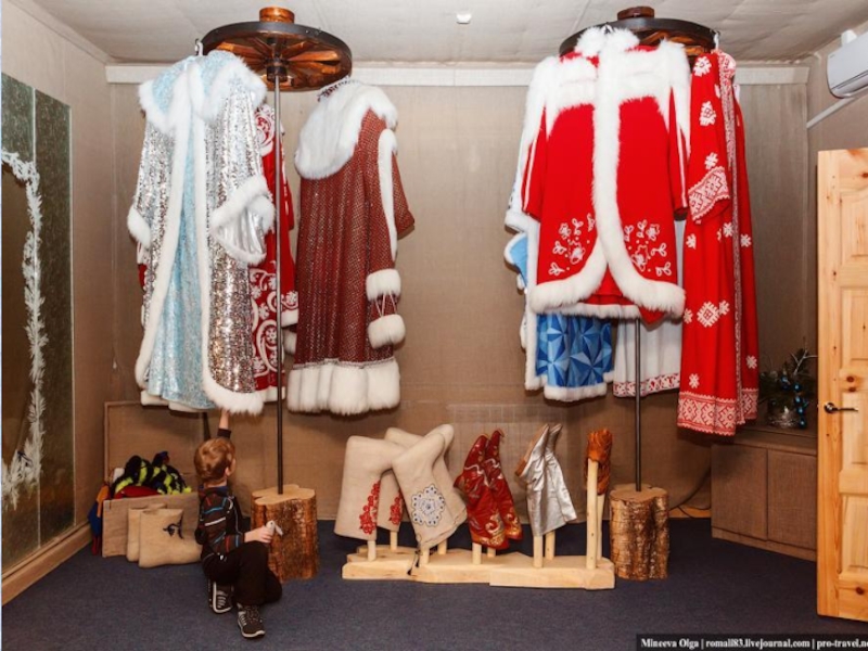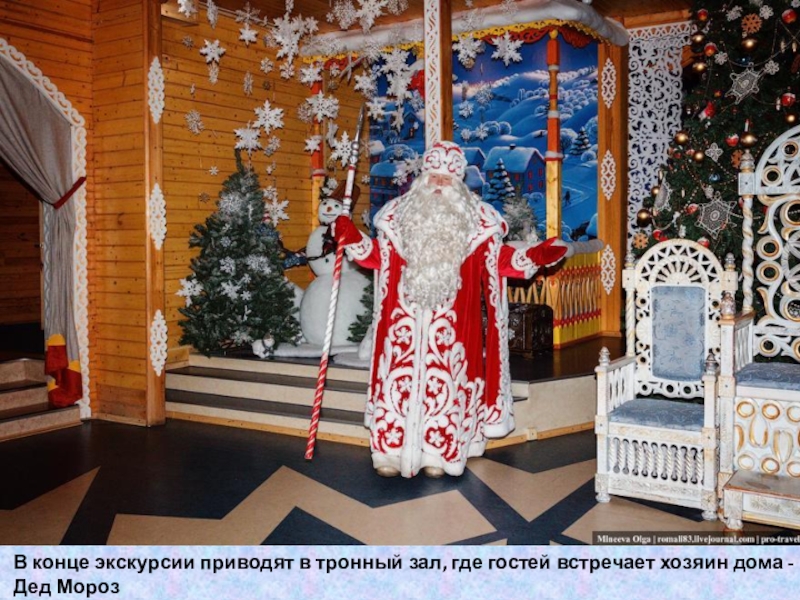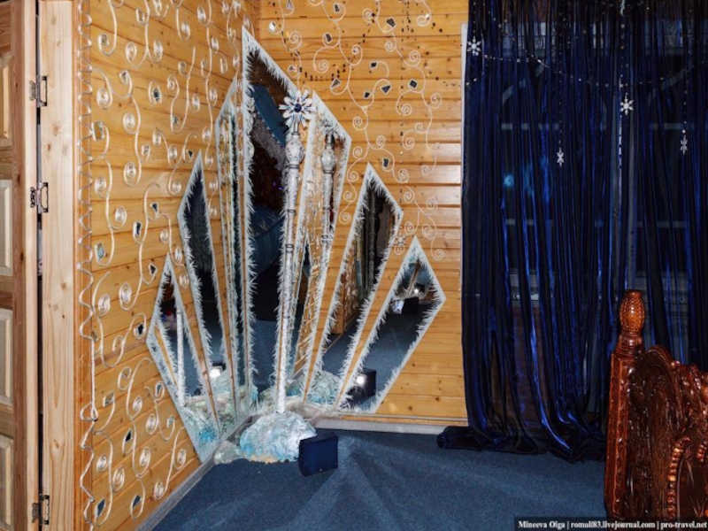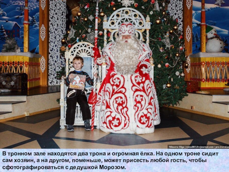 троне сидит сам хозяин, а на другом, поменьше, может присесть любой гость, чтобы сфотографироваться с дедушкой Морозом.