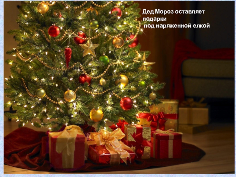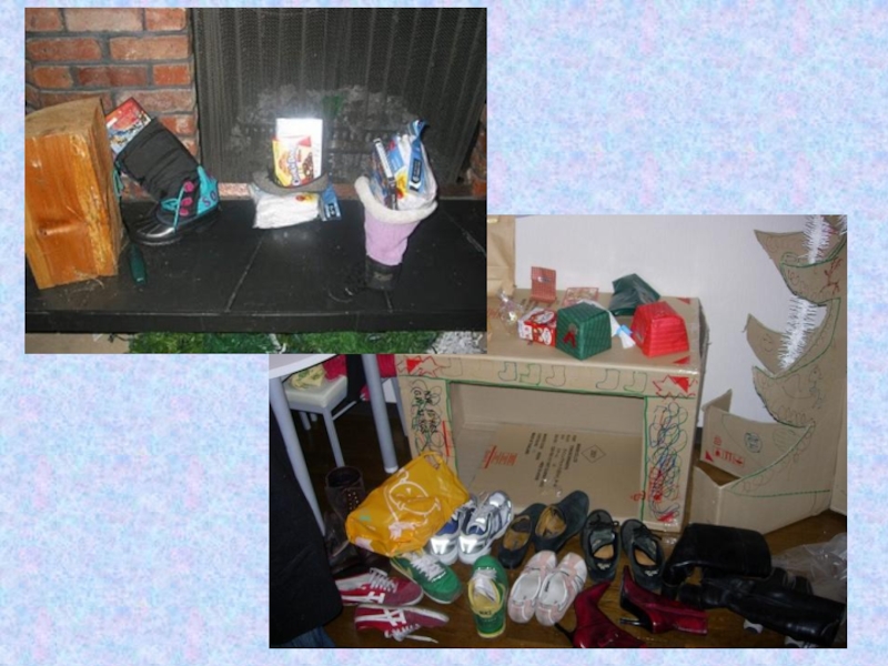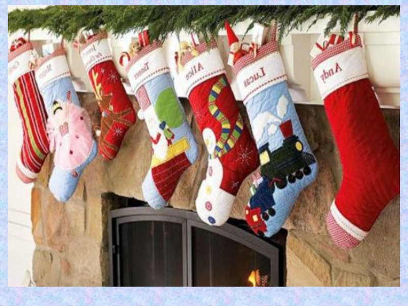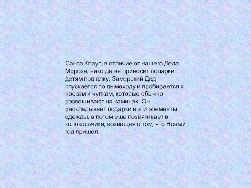 подарки детям под елку. Заморский Дед спускается по дымоходу и пробирается к носкам и чулкам, которые обычно развешивают на каминах. Он раскладывает подарки в эти элементы одежды, а потом еще позвякивает в колокольчики, возвещая о том, что Новый год пришел.