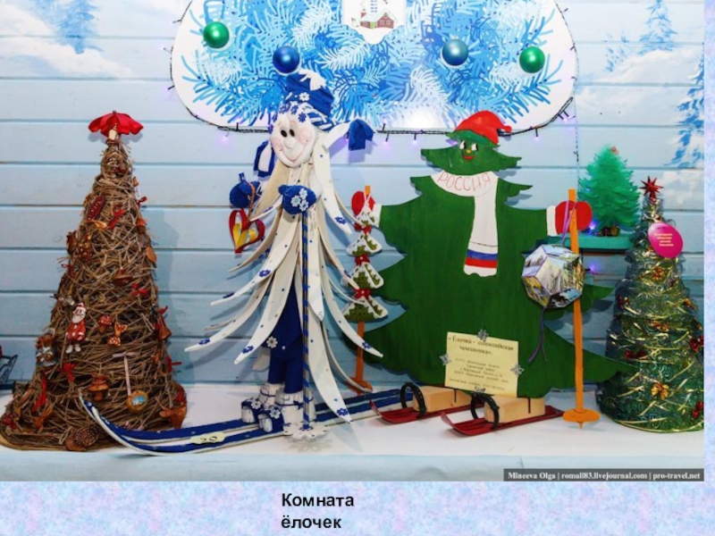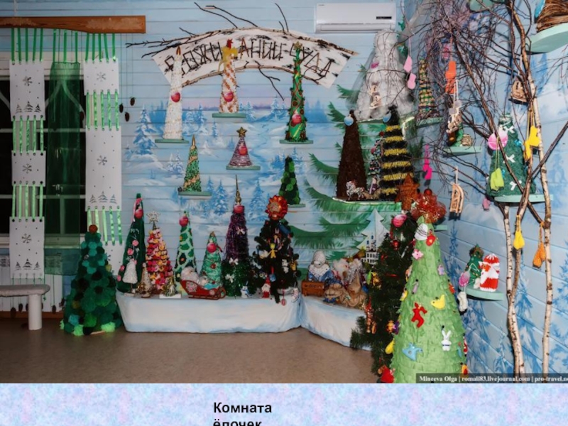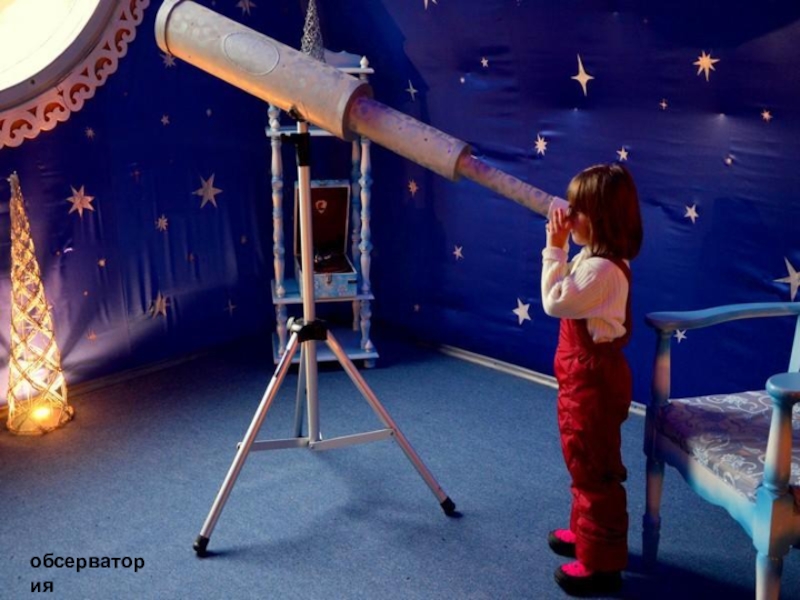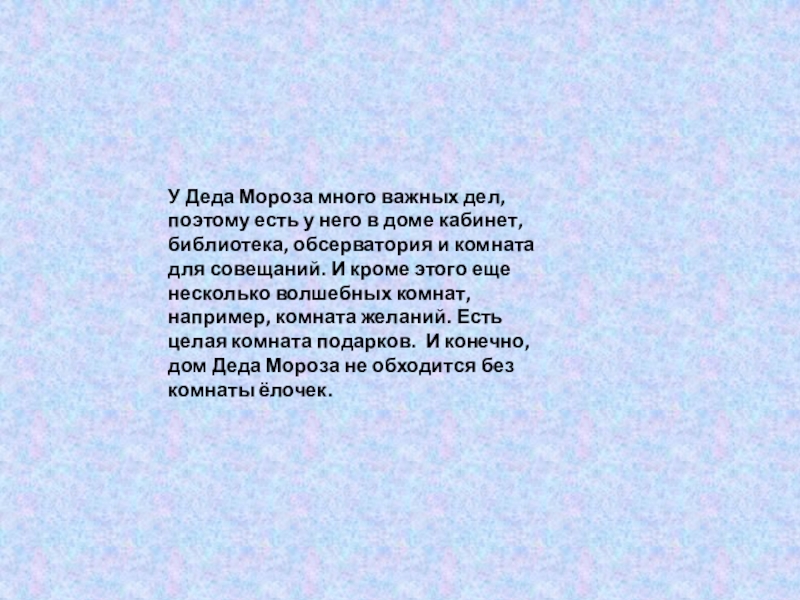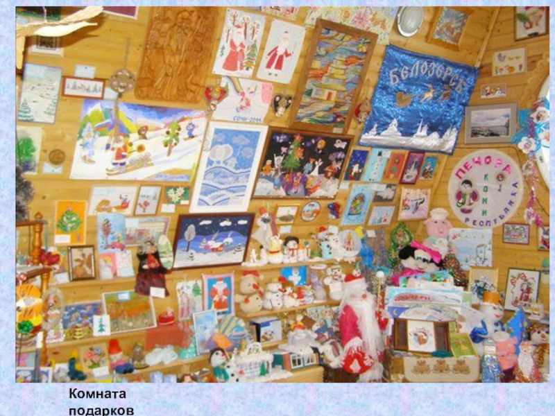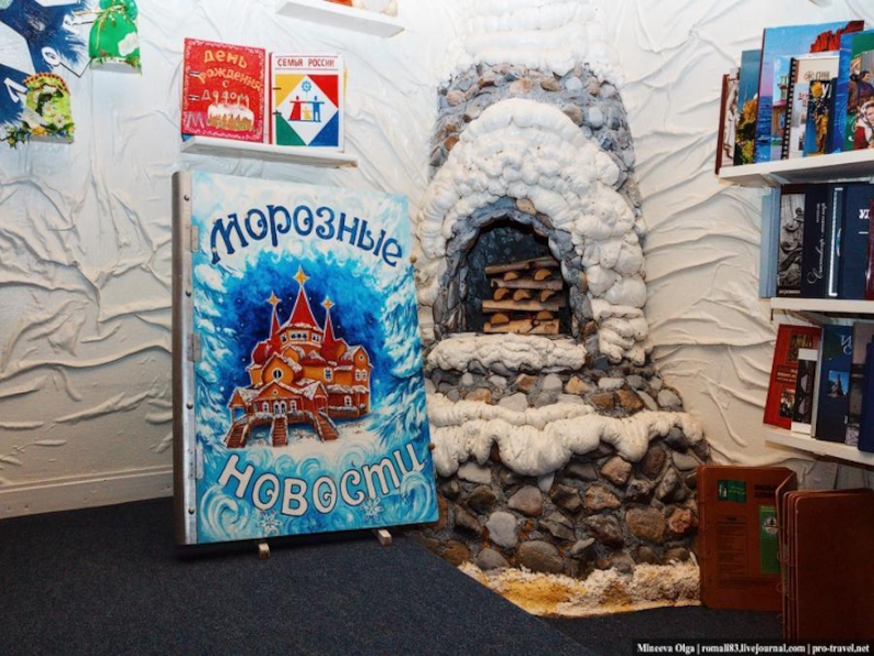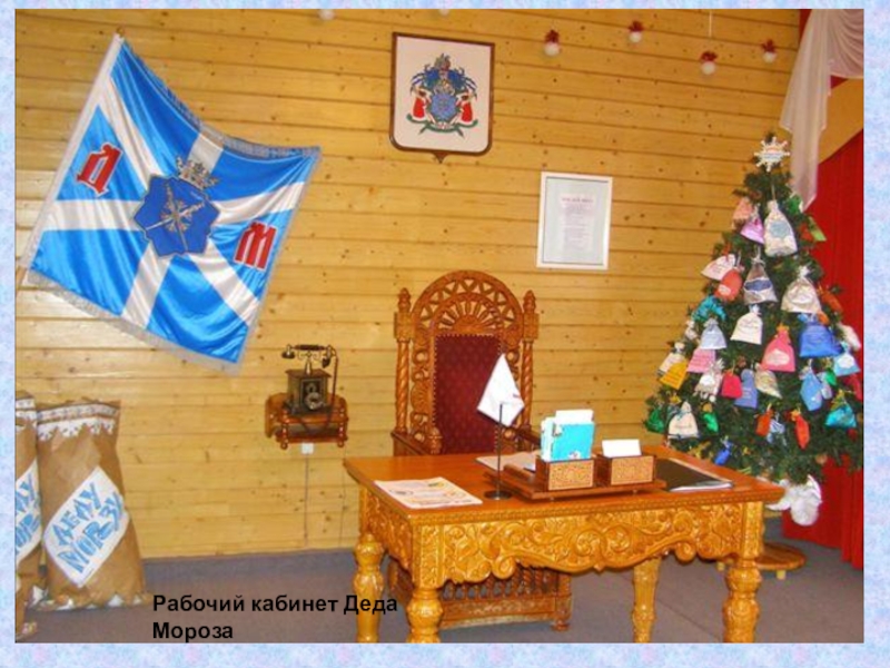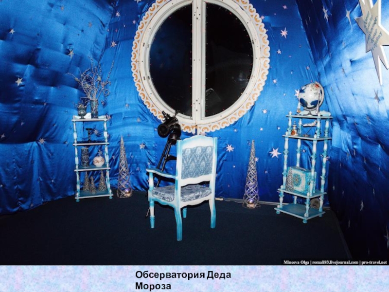 доме кабинет, библиотека, обсерватория и комната для совещаний. И кроме этого еще несколько волшебных комнат, например, комната желаний. Есть целая комната подарков. И конечно, дом Деда Мороза не обходится без комнаты ёлочек.