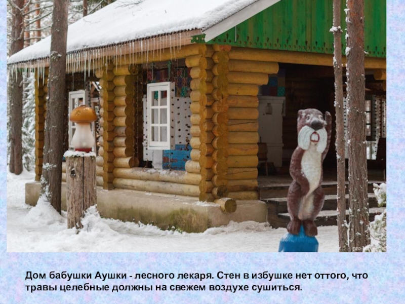 Слайд 57Дом бабушки Аушки - лесного лекаря. Стен в избушке нет оттого,