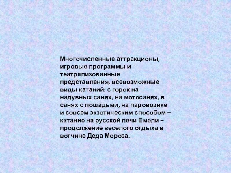 Слайд 67Многочисленные аттракционы, игровые программы и театрализованные представления, всевозможные виды катаний: с