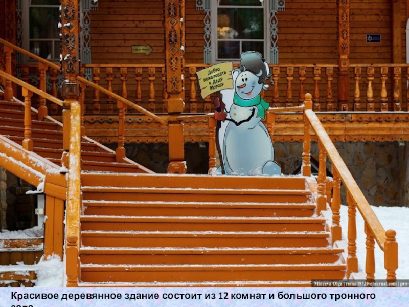 Слайд 13Красивое деревянное здание состоит из 12 комнат и большого тронного зала