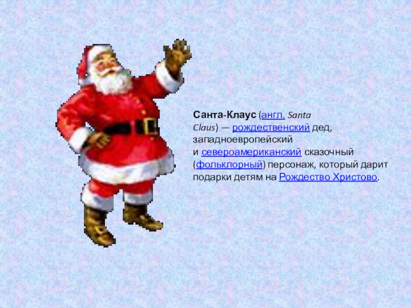 Слайд 85Санта-Клаус (англ. Santa Claus) — рождественский дед, западноевропейский и североамериканский сказочный (фольклорный) персонаж, который дарит подарки детям на Рождество