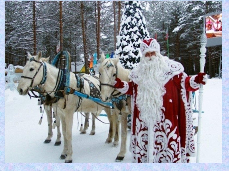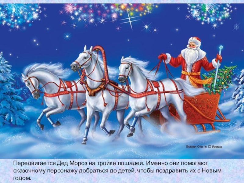 Слайд 6Передвигается Дед Мороз на тройке лошадей. Именно они помогают сказочному персонажу