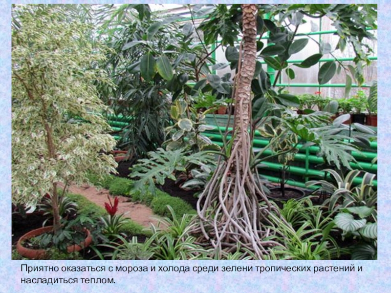 Слайд 79Приятно оказаться с мороза и холода среди зелени тропических растений и