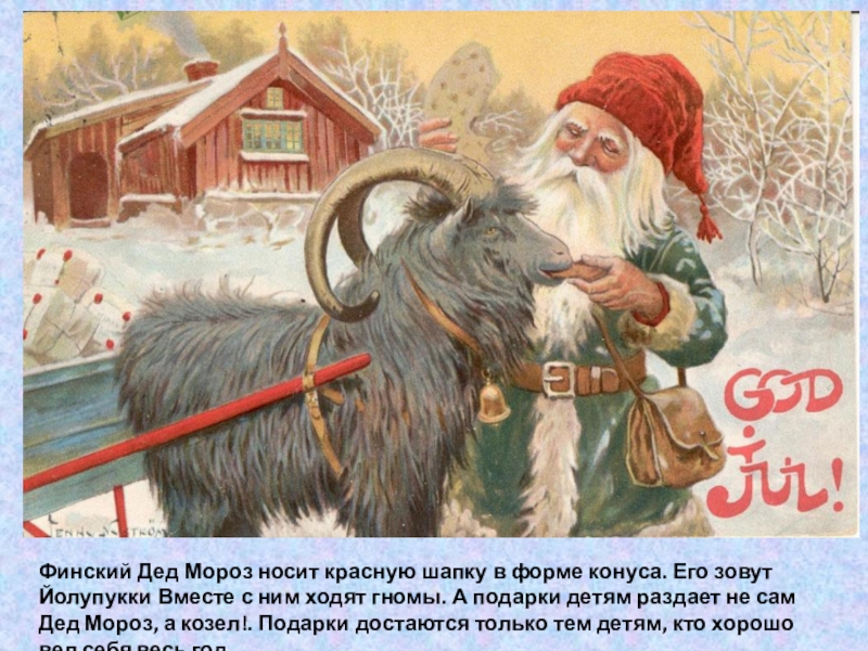 Слайд 102Финский Дед Мороз носит красную шапку в форме конуса. Его зовут