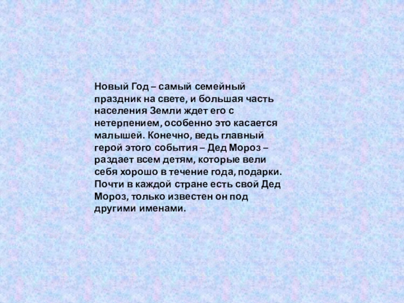 населения Земли ждет его с нетерпением, особенно это касается малышей. Конечно, ведь главный герой этого события – Дед Мороз – раздает всем детям, которые вели себя хорошо в течение года, подарки. Почти в каждой стране есть свой Дед Мороз, только известен он под другими именами.