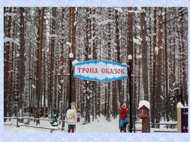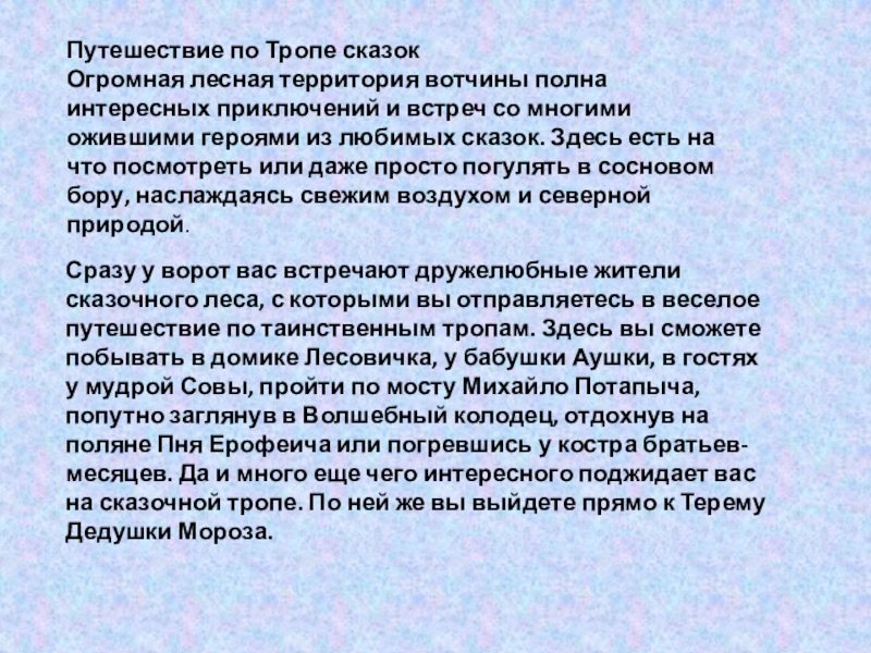 Сразу у ворот вас встречают дружелюбные жители сказочного леса, с которыми вы отправляетесь в веселое путешествие по таинственным тропам. Здесь вы сможете побывать в домике Лесовичка, у бабушки Аушки, в гостях у мудрой Совы, пройти по мосту Михайло Потапыча, попутно заглянув в Волшебный колодец, отдохнув на поляне Пня Ерофеича или погревшись у костра братьев-месяцев. Да и много еще чего интересного поджидает вас на сказочной тропе. По ней же вы выйдете прямо к Терему Дедушки Мороза.