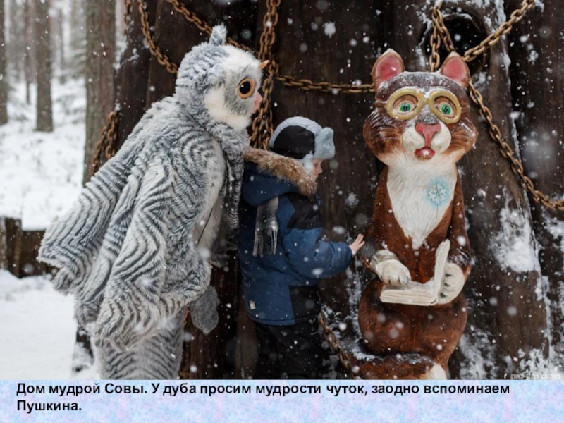 Слайд 54Дом мудрой Совы. У дуба просим мудрости чуток, заодно вспоминаем Пушкина.