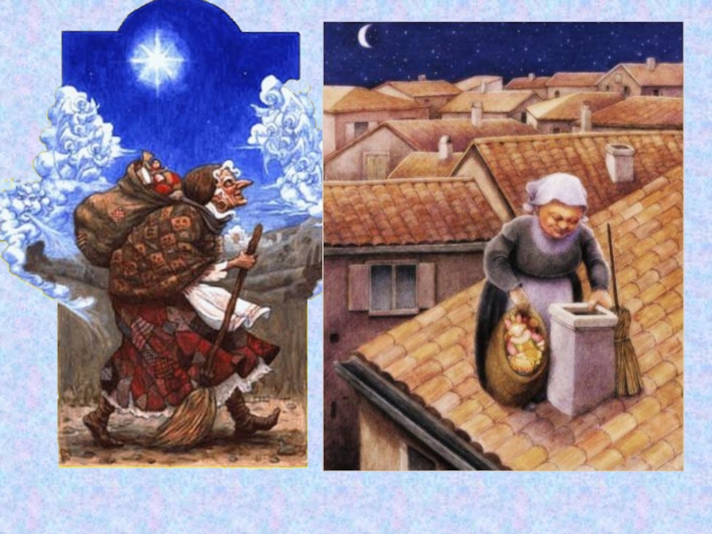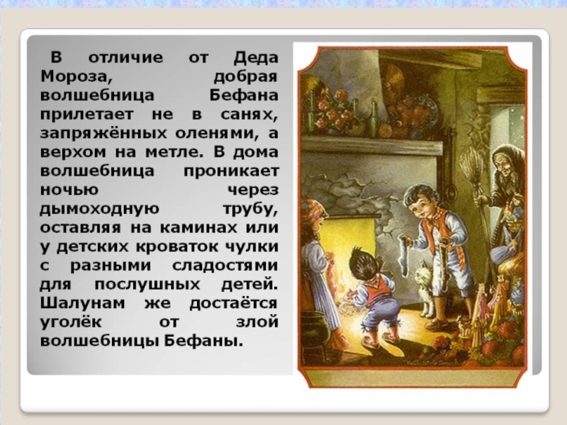 Через трубу дома прилетает волшебница Бефане и у каждой кроватки оставляет новогодние подарки.