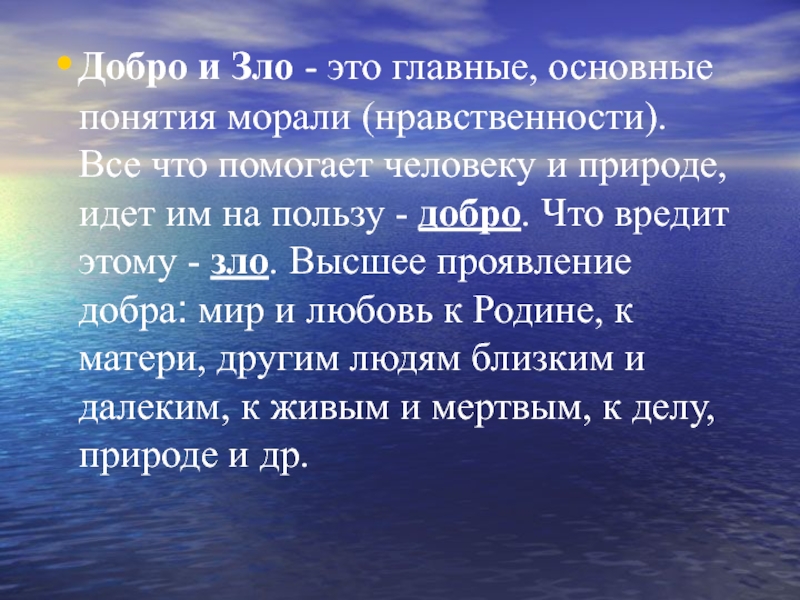 что помогает человеку и природе, идет им на пользу - добро. Что вредит этому - зло. Высшее проявление добра: мир и любовь к Родине, к матери, другим людям близким и далеким, к живым и мертвым, к делу, природе и др.