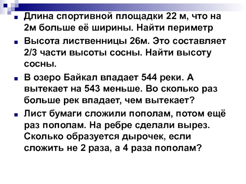 Длина спортивной площадки 22 м, что на 2м больше её ширины. Найти периметрВысота лиственницы 26м. Это составляет 2/3 части высоты сосны. Найти высоту сосны.В озеро Байкал впадает 544 реки. А вытекает на 543 меньше. Во сколько