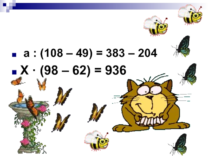 а : (108 – 49) = 383 – 204Х · (98 – 62) = 936