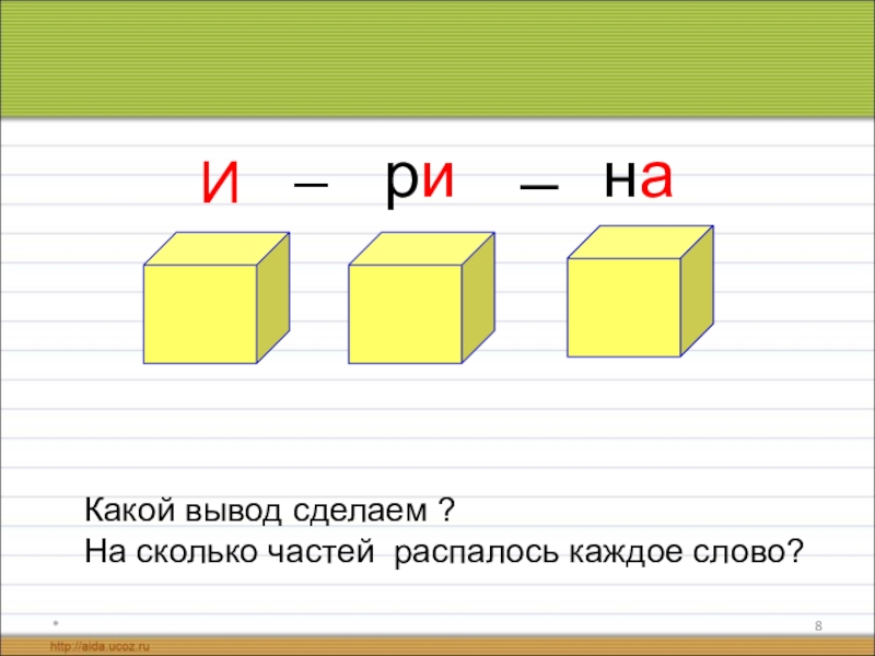 *рина И__ Какой вывод сделаем ? На сколько частей распалось каждое слово?
