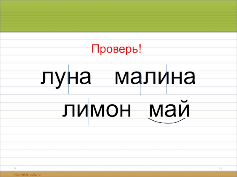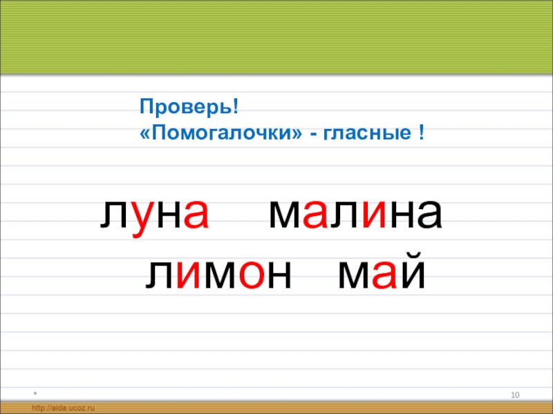 *луна  малина  лимон  майПроверь! «Помогалочки» - гласные !