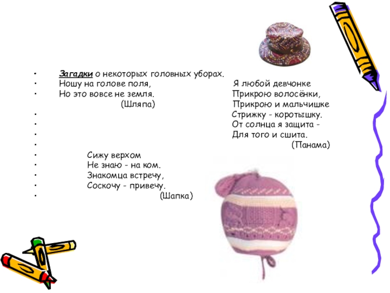 Слайд 6Загадки о некоторых головных уборах.