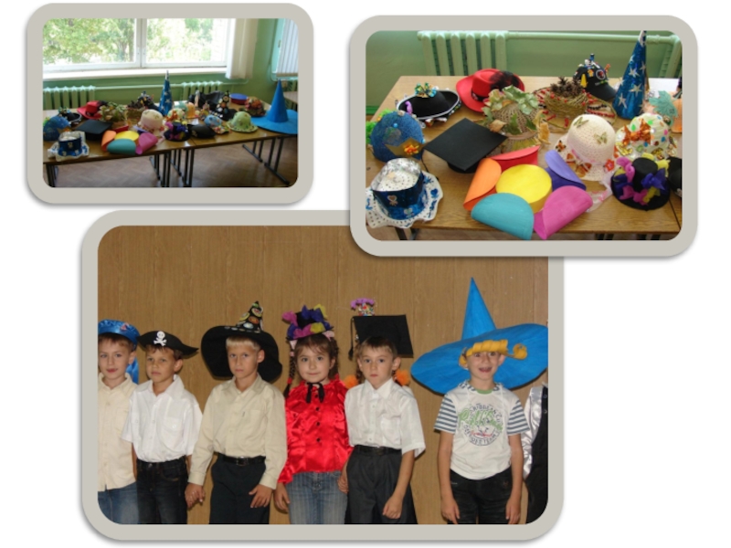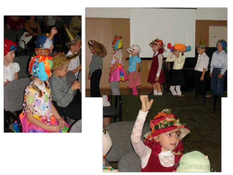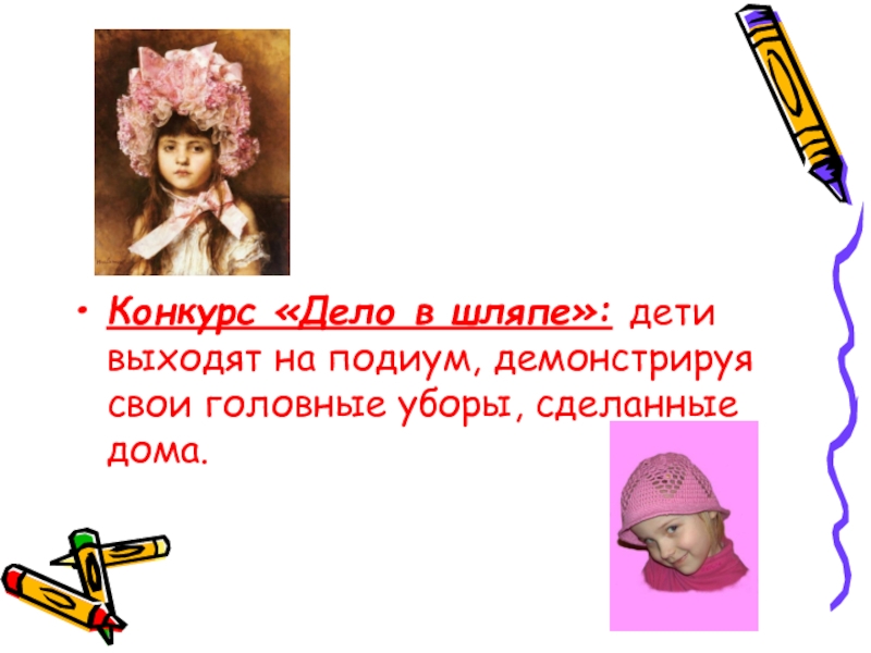 Слайд 14Конкурс «Дело в шляпе»: дети выходят на подиум, демонстрируя свои головные