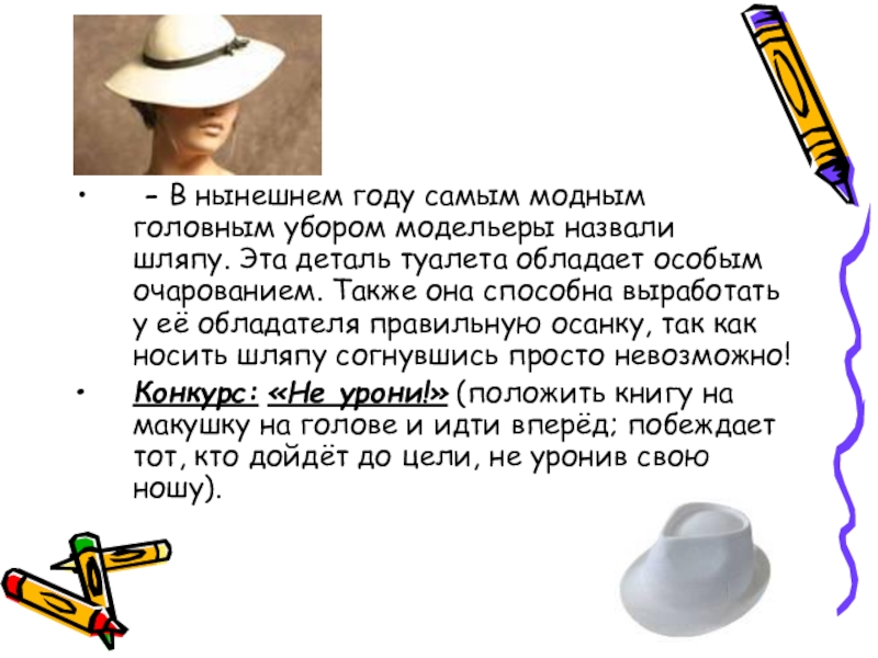 шляпу. Эта деталь туалета обладает особым очарованием. Также она способна выработать у её обладателя правильную осанку, так как носить шляпу согнувшись просто невозможно!