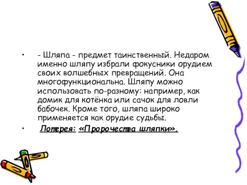 Слайд 11- Шляпа - предмет таинственный. Недаром именно шляпу избрали фокусники орудием