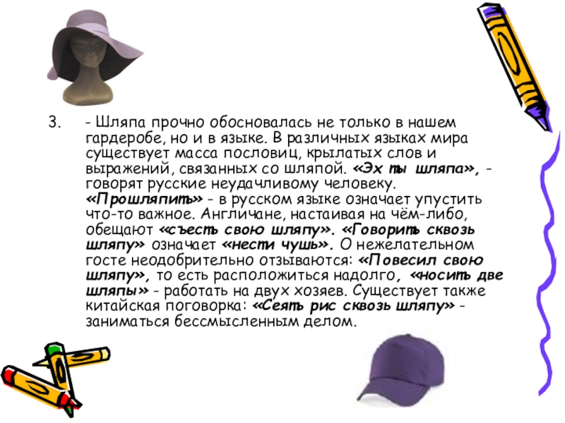гардеробе, но и в языке. В различных языках мира существует масса пословиц, крылатых слов и выражений, связанных со шляпой. «Эх ты шляпа», - говорят русские неудачливому человеку. «Прошляпить» - в русском языке означает упустить что-то важное. Англичане, настаивая на чём-либо, обещают «съесть свою шляпу». «Говорить сквозь шляпу» означает «нести чушь». О нежелательном госте неодобрительно отзываются: «Повесил свою шляпу», то есть расположиться надолго, «носить две шляпы» - работать на двух хозяев. Существует также китайская поговорка: «Сеять рис сквозь шляпу» - заниматься бессмысленным делом.