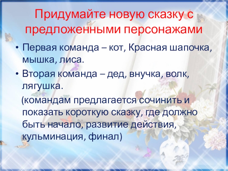 (командам предлагается сочинить и показать короткую сказку, где должно быть начало, развитие действия, кульминация, финал)
