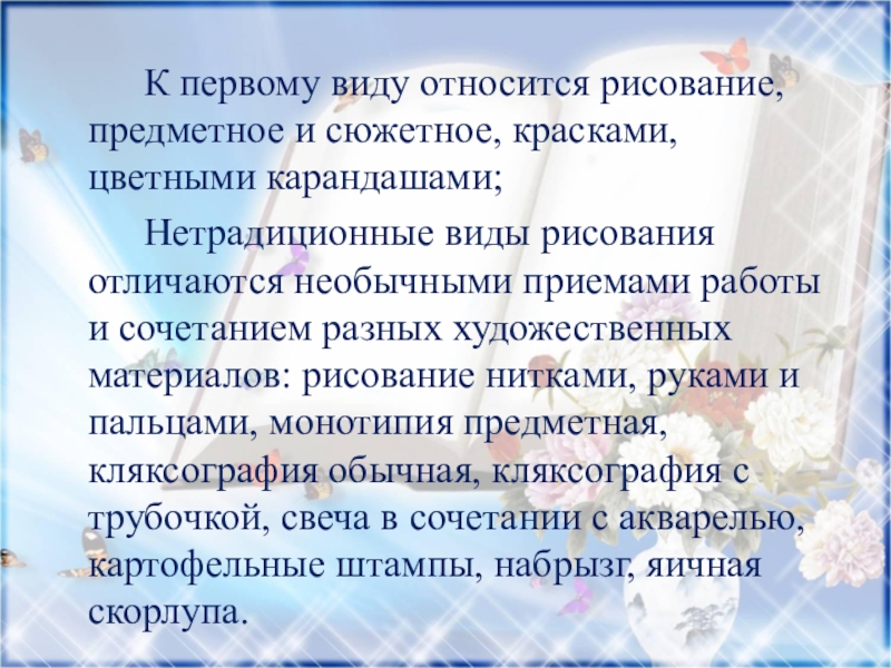 Нетрадиционные виды рисования отличаются необычными приемами работы и сочетанием разных художественных материалов: рисование нитками, руками и пальцами, монотипия предметная, кляксография обычная, кляксография с трубочкой, свеча в сочетании с акварелью, картофельные штампы, набрызг, яичная скорлупа.