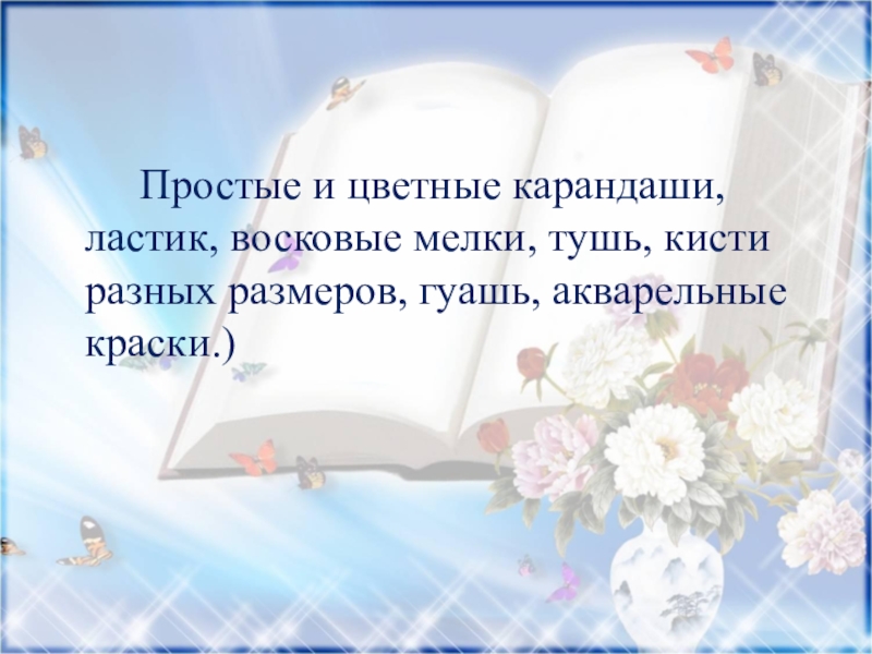 Слайд 6 Простые и цветные карандаши, ластик, восковые мелки, тушь, кисти разных размеров,
