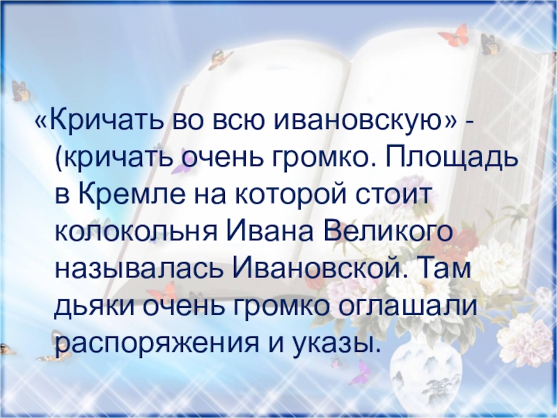 Слайд 28«Кричать во всю ивановскую» - (кричать очень громко. Площадь в Кремле