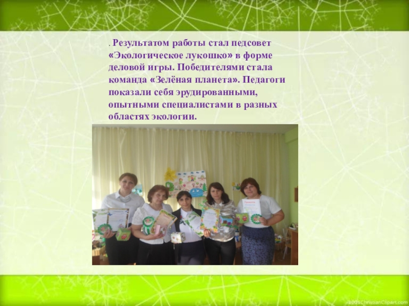 . Результатом работы стал педсовет «Экологическое лукошко» в форме деловой игры. Победителями стала команда «Зелёная планета». Педагоги