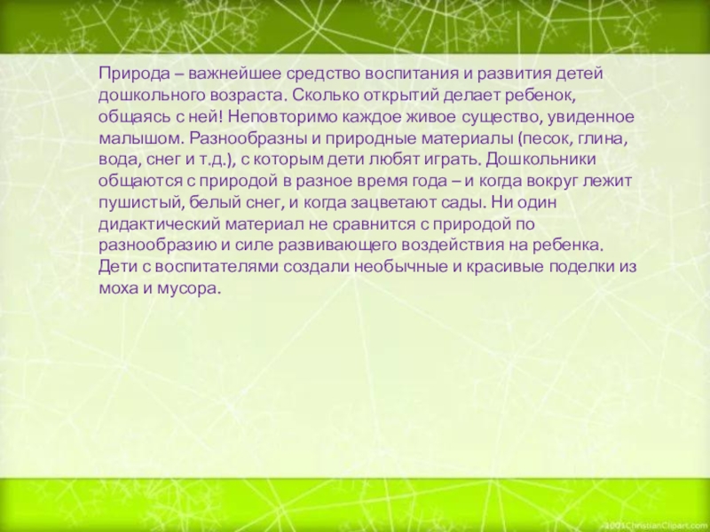 открытий делает ребенок, общаясь с ней! Неповторимо каждое живое существо, увиденное малышом. Разнообразны и природные материалы (песок, глина, вода, снег и т.д.), с которым дети любят играть. Дошкольники общаются с природой в разное время года – и когда вокруг лежит пушистый, белый снег, и когда зацветают сады. Ни один дидактический материал не сравнится с природой по разнообразию и силе развивающего воздействия на ребенка. Дети с воспитателями создали необычные и красивые поделки из моха и мусора.
