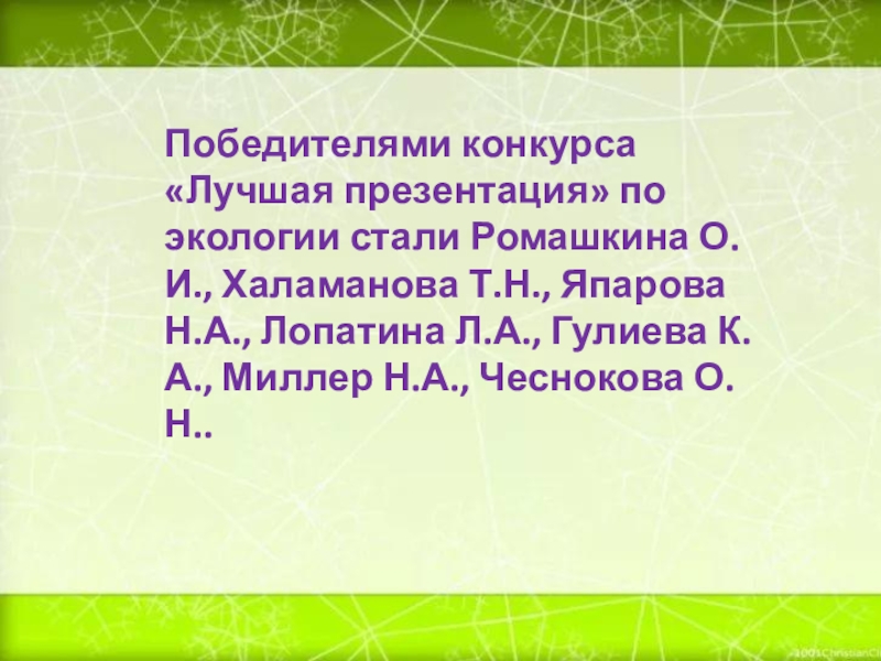 Слайд 11Победителями конкурса «Лучшая презентация» по экологии стали Ромашкина О.И., Халаманова Т.Н.,