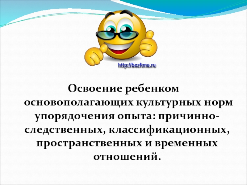 Освоение ребенком основополагающих культурных норм упорядочения опыта: причинно-следственных, классификационных, пространственных и временных отношений.