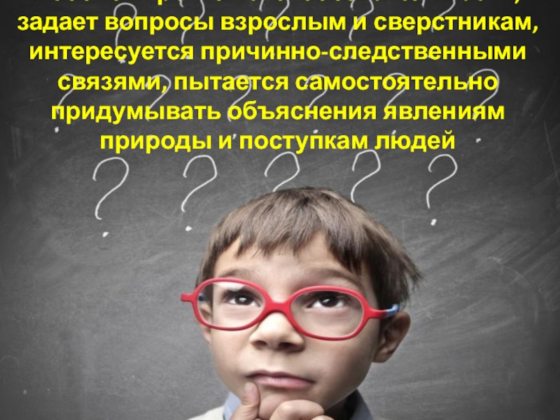 Слайд 9Ребенок проявляет любознательность, задает вопросы взрослым и сверстникам, интересуется причинно-следственными связями,