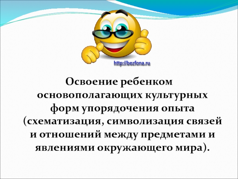 Освоение ребенком основополагающих культурных форм упорядочения опыта (схематизация, символизация связей и