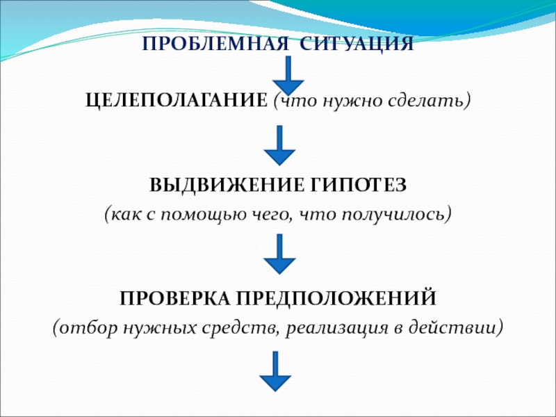 ПРОБЛЕМНАЯ СИТУАЦИЯЦЕЛЕПОЛАГАНИЕ (что нужно сделать)ВЫДВИЖЕНИЕ ГИПОТЕЗ(как с помощью чего, что получилось)ПРОВЕРКА ПРЕДПОЛОЖЕНИЙ(отбор нужных средств, реализация в действии)