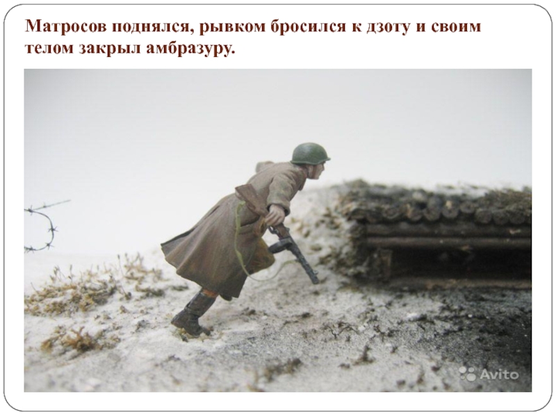 Слайд 11Матросов поднялся, рывком бросился к дзоту и своим телом закрыл амбразуру.