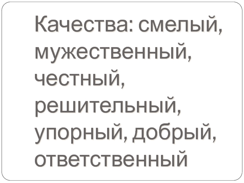Слайд 29Качества: смелый, мужественный, честный, решительный, упорный, добрый, ответственный