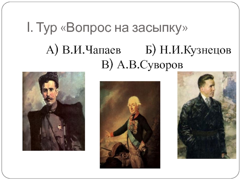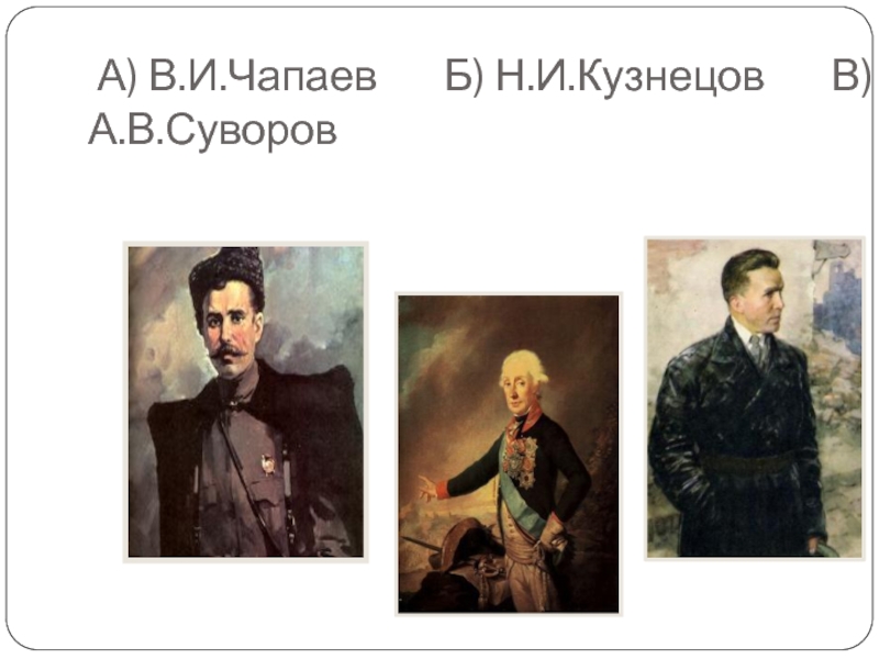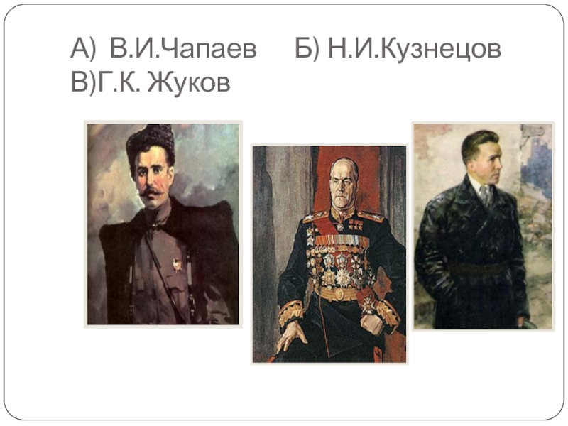Слайд 31А) В.И.Чапаев Б) Н.И.Кузнецов В)Г.К. Жуков