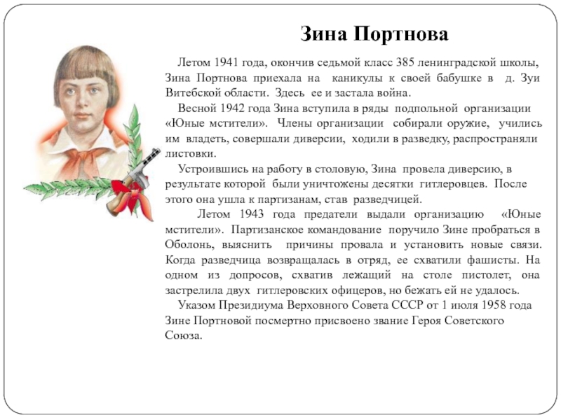 Зина Портнова приехала на каникулы к своей бабушке в д. Зуи Витебской области. Здесь ее и застала война.