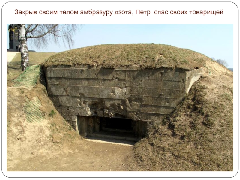 Слайд 23Закрыв своим телом амбразуру дзота, Петр спас своих товарищей