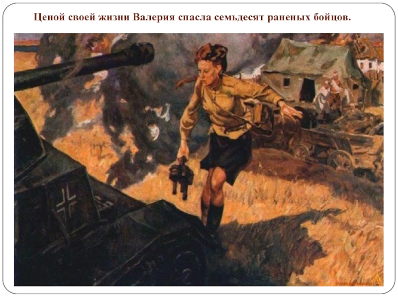 Слайд 20Ценой своей жизни Валерия спасла семьдесят раненых бойцов.