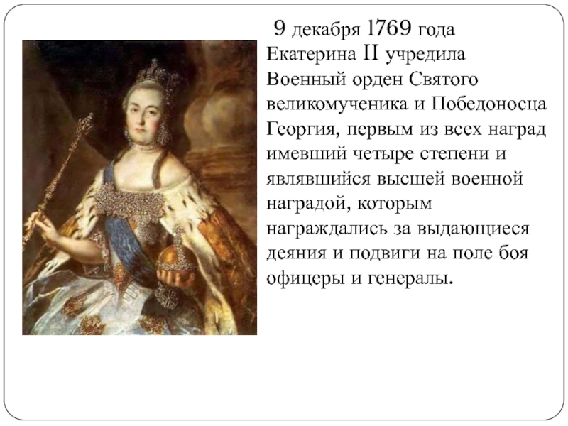 Слайд 4 9 декабря 1769 года Екатерина II учредила Военный орден