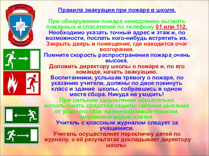 Правила эвакуация при пожаре в школе.При обнаружении пожара немедленно вызвать пожарных и спасателей по телефону 01 или