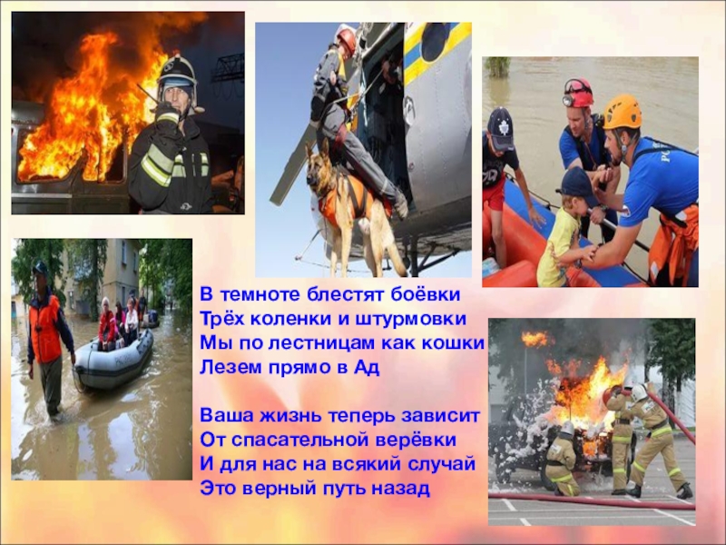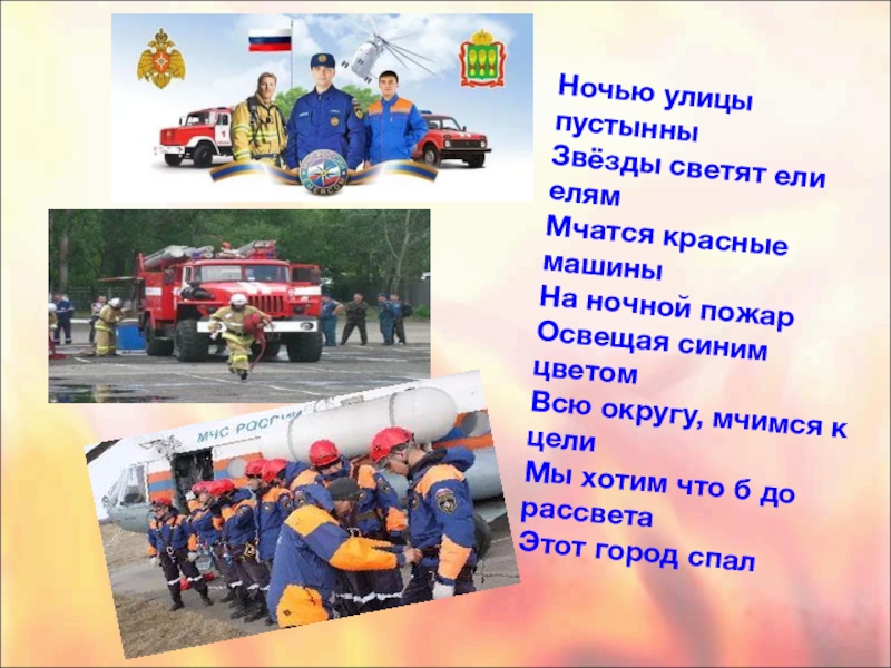 Ночью улицы пустынныЗвёзды светят ели елямМчатся красные машиныНа ночной пожарОсвещая синим цветомВсю округу, мчимся к целиМы хотим