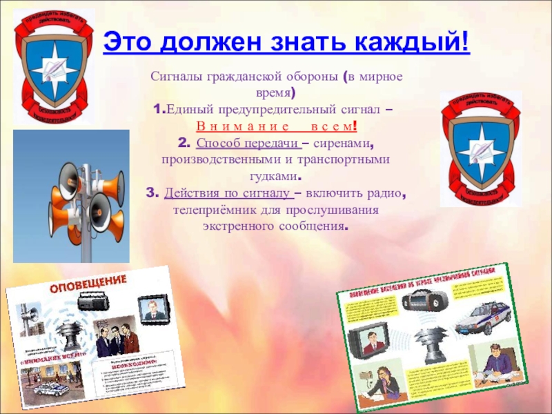 Это должен знать каждый! Сигналы гражданской обороны (в мирное время)Единый предупредительный сигнал – В н и м а