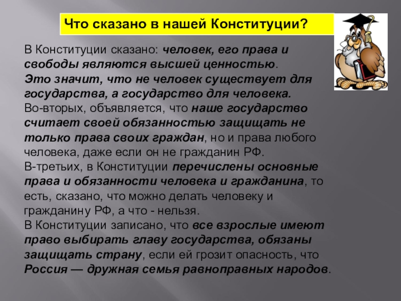 Главная наша обязанность соблюдать законы, хорошо учиться, выбрать профессию и стать достойными гражданами своей Родины.
