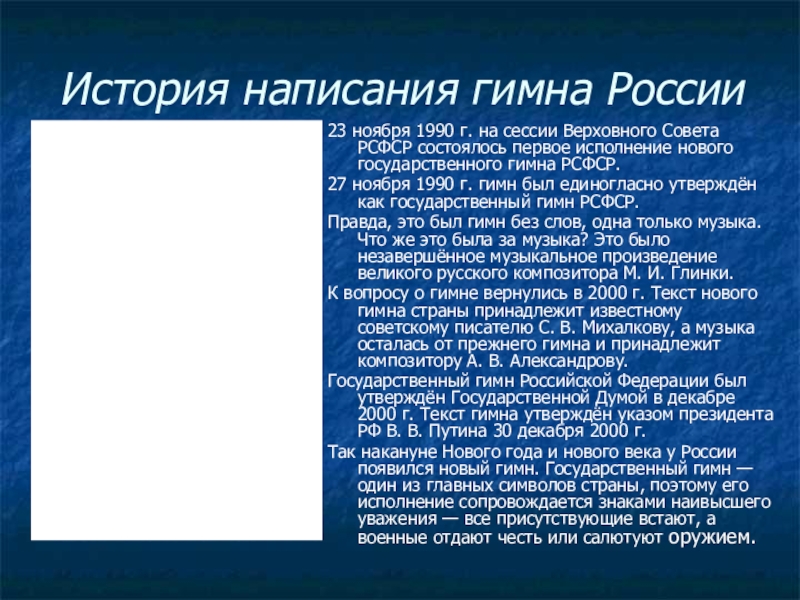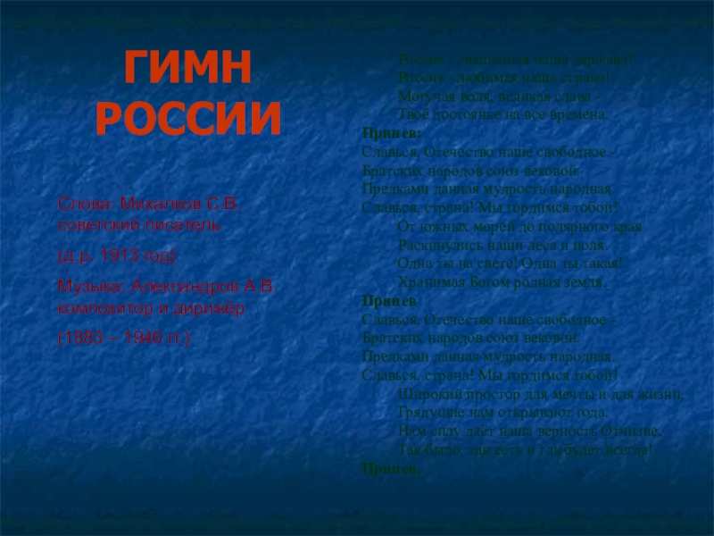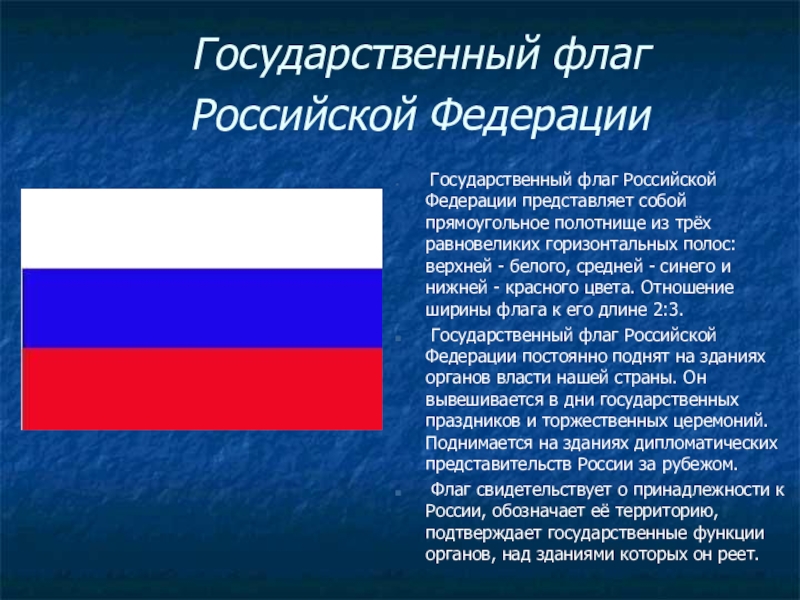Государственный флаг Российской Федерации представляет собой прямоугольное полотнище из трёх равновеликих горизонтальных полос: верхней - белого, средней - синего и нижней - красного цвета. Отношение ширины флага к его длине 2:3.